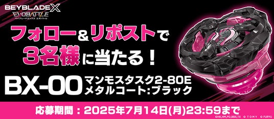 公式Xでは、ゲーム発売発表を記念してアプリ・イベント限定で入手可能なレアベイ『BX-00マンモスタスク2-80E メタルコート:ブラック』を抽選で3名様にプレゼントするキャンペーンを実施しています。