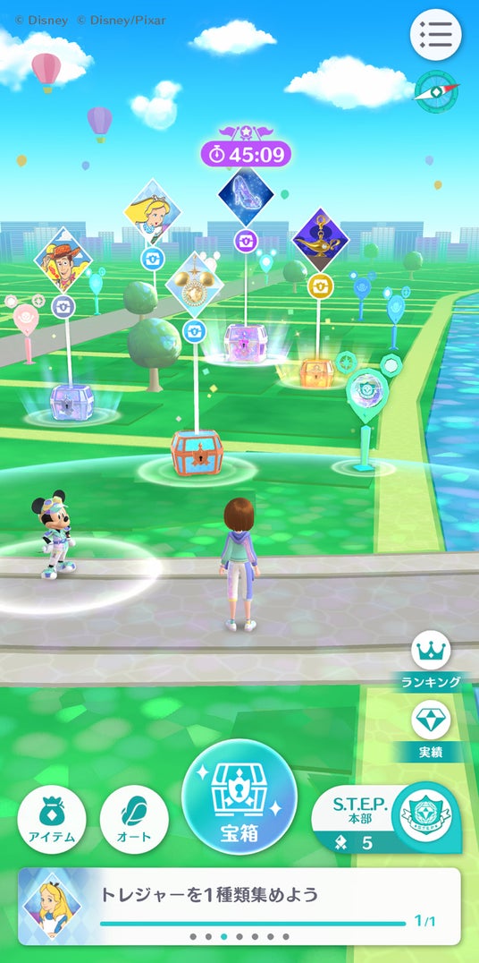 リアルライフ宝探しゲーム『Disney STEP(ディズニー ステップ)』は、位置情報機能を活用したスマートフォン向けのゲームアプリです。いつも暮らしている街が宝探しの舞台へと変わり、ゲーム内に登場するミッキーたちと一緒に宝探しを楽しめます。プレイヤーは街に隠されたディズニー作品をモチーフにした宝物「トレジャー」を探して、コレクションしていきます。