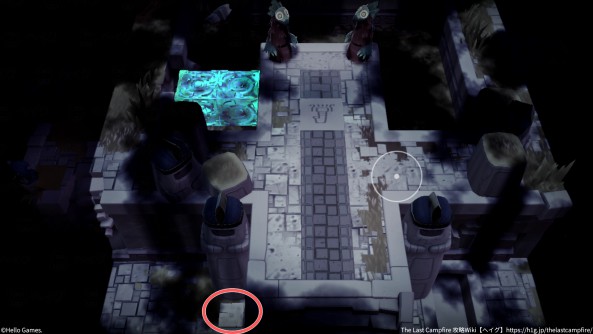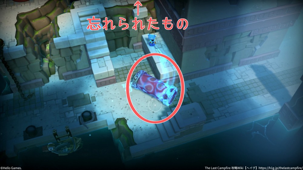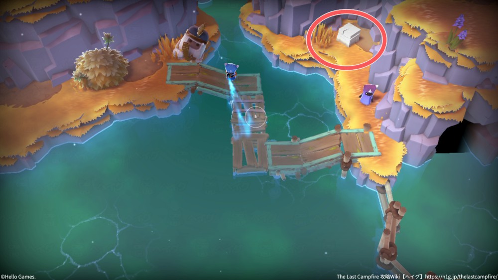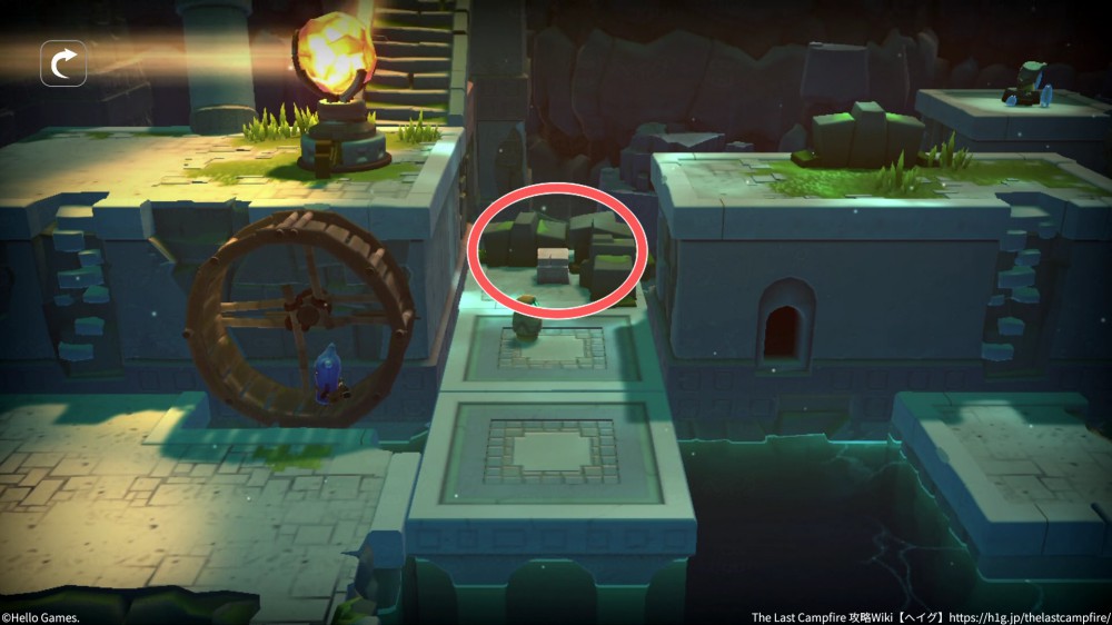 | 19 | ▼小渓谷の沼地(キャンプファイヤー)|キャンプファイヤーの左側にある鎖を下ろし、2つのブロックを岩の上に乗せる。![]() ▼ブロックは、岩の近くと高台の上(▼画像)にある。 ![]() |