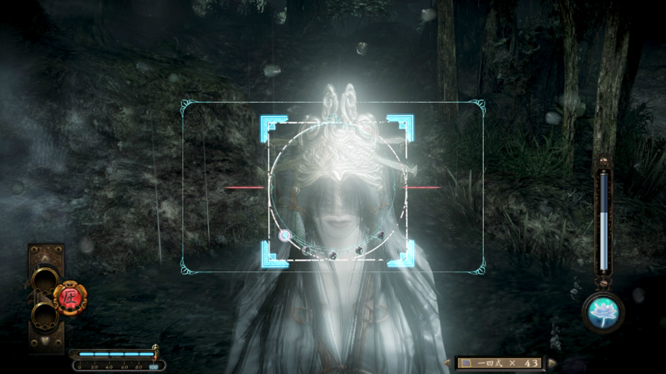 - センターサークル内に怨霊を捉え、特定のボタンを押し続けると、怨霊を追いかけて自動的に画面の中央に捉えます。